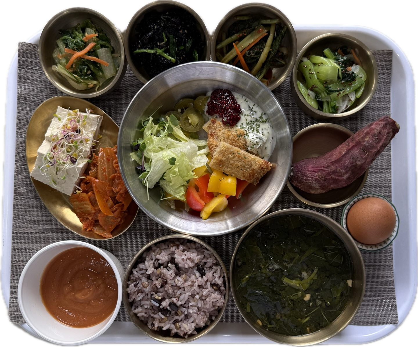 다슬기아욱국, 두부김치, 부추자반무침, 얼갈이된장나물, 슈니첼, 청경채통들깨무침 등