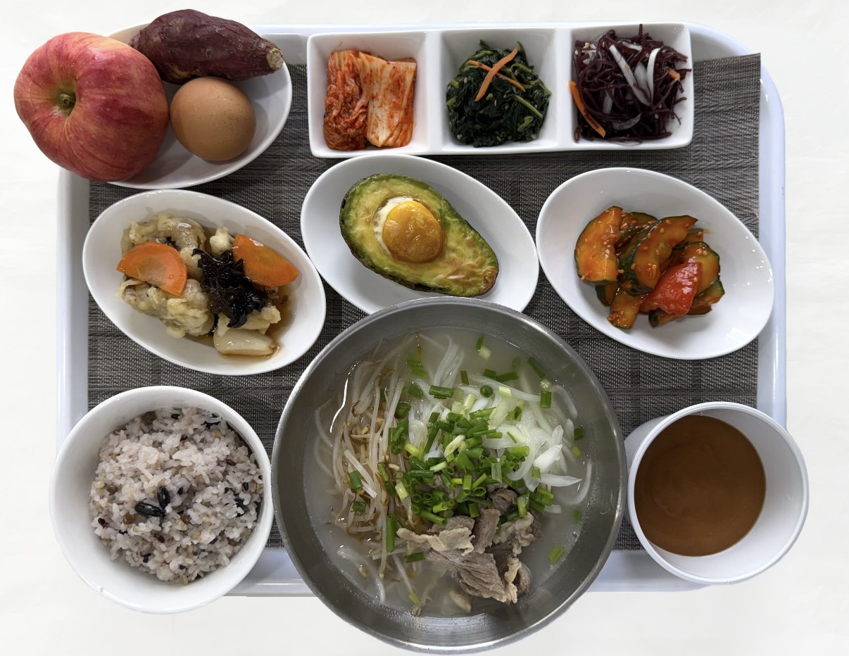 쌀국수, 표고탕수, 깻잎순나물, 오이생채, 꼬시래기무우무침, 아보카도계란구이 등
