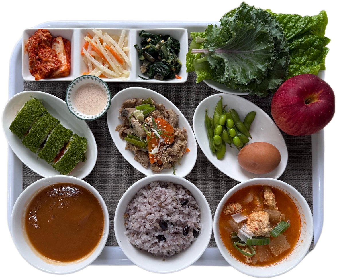 알탕, 버섯우불고기, 감자채볶음, 근대나물, 아보카도감태김밥, 풋콩찜 등