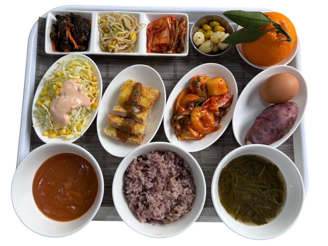 쑥보리국, 수제돈까스&양송이소스, 물미역초무침, 콩나물무침, 해물떡찜, 마늘은행구이, 한라봉, 고구마 등