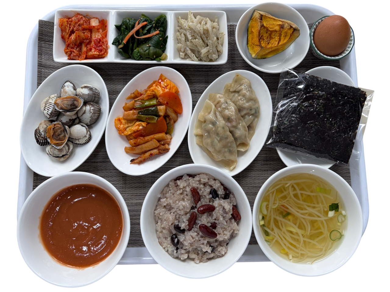 찰밥, 콩나물국, 오징어야채볶음, 도시락김, 섬초나물, 수제만두찜, 들깨무나물, 새꼬막찜, 단호박찜 등