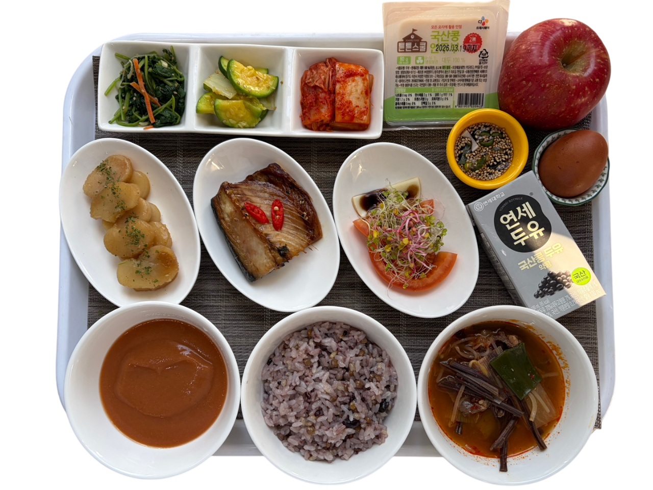 육개장, 고등어구이, 애호박볶음, 취나물무침, 관자버터구이, 양배추&케일숙, 연두부&양념장, 약콩두유 등