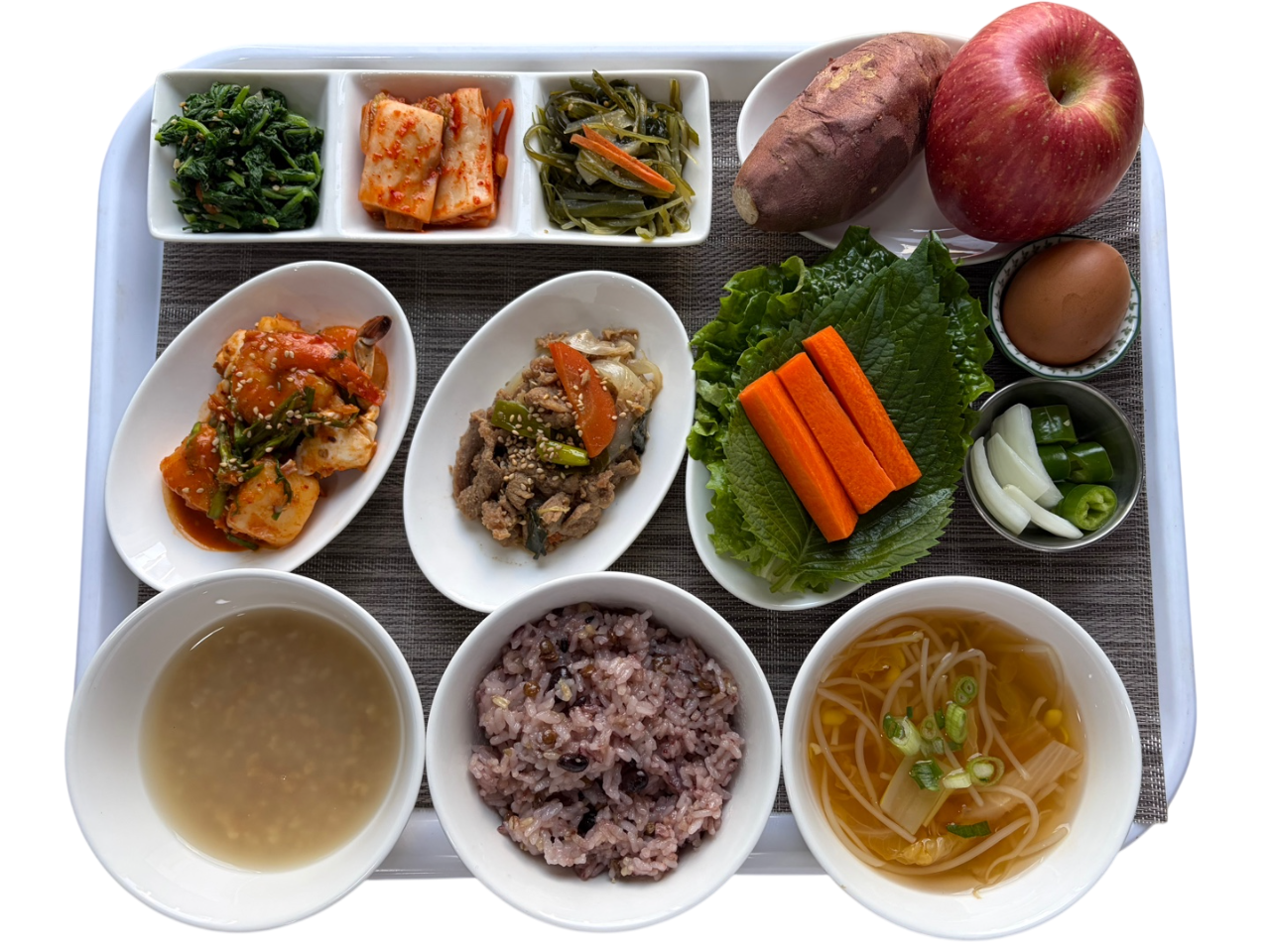 김치콩나물국, 우불고기, 미역줄기볶음, 열무된장나물, 해물떡짐, 쌈채소, 오이고추&양파&쌈장, 고구마