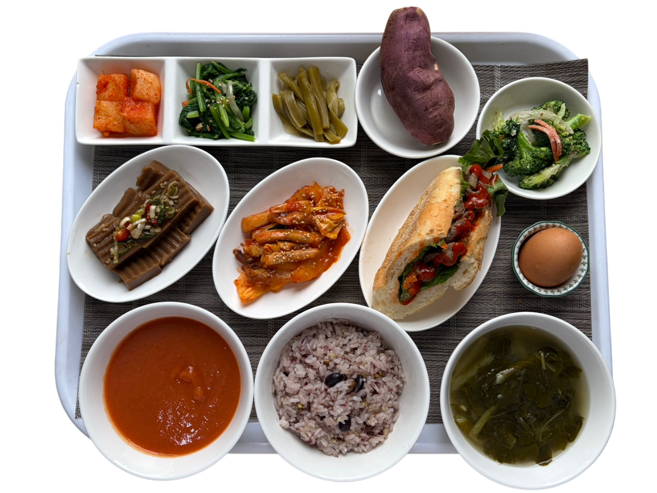 시래기된장국, 오징어야채볶음, 도토리묵&양념장, 열무나물, 반미샌드위치, 브로컬리참깨무침, 고구마 등