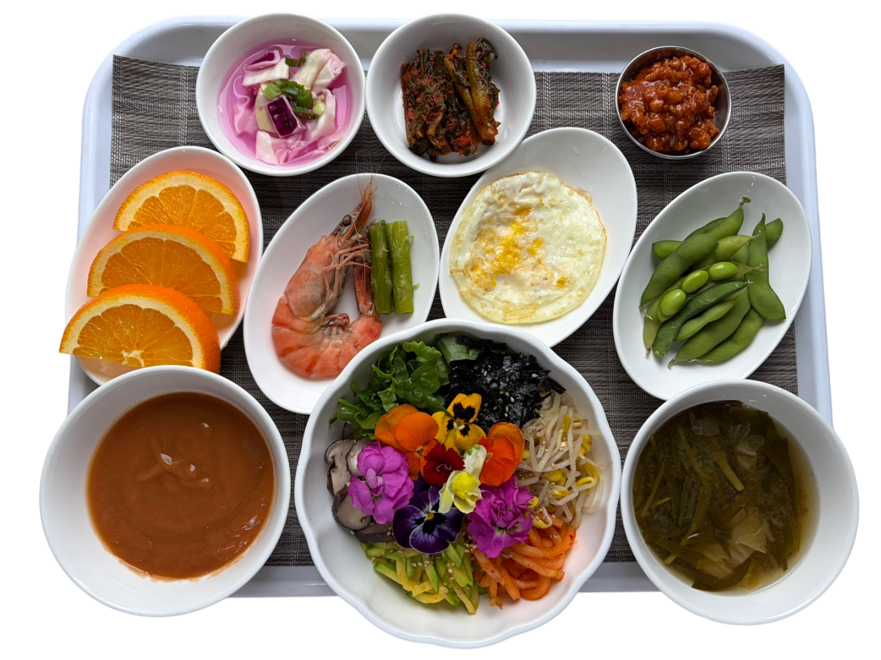 보리순김칫국, 약고추장볶음&콩나물무침&무생채&표고볶음&애호박채&상추채&김가루, 대하&아스파라거스, 계란후라이, 오렌지, 풋콩찜 등