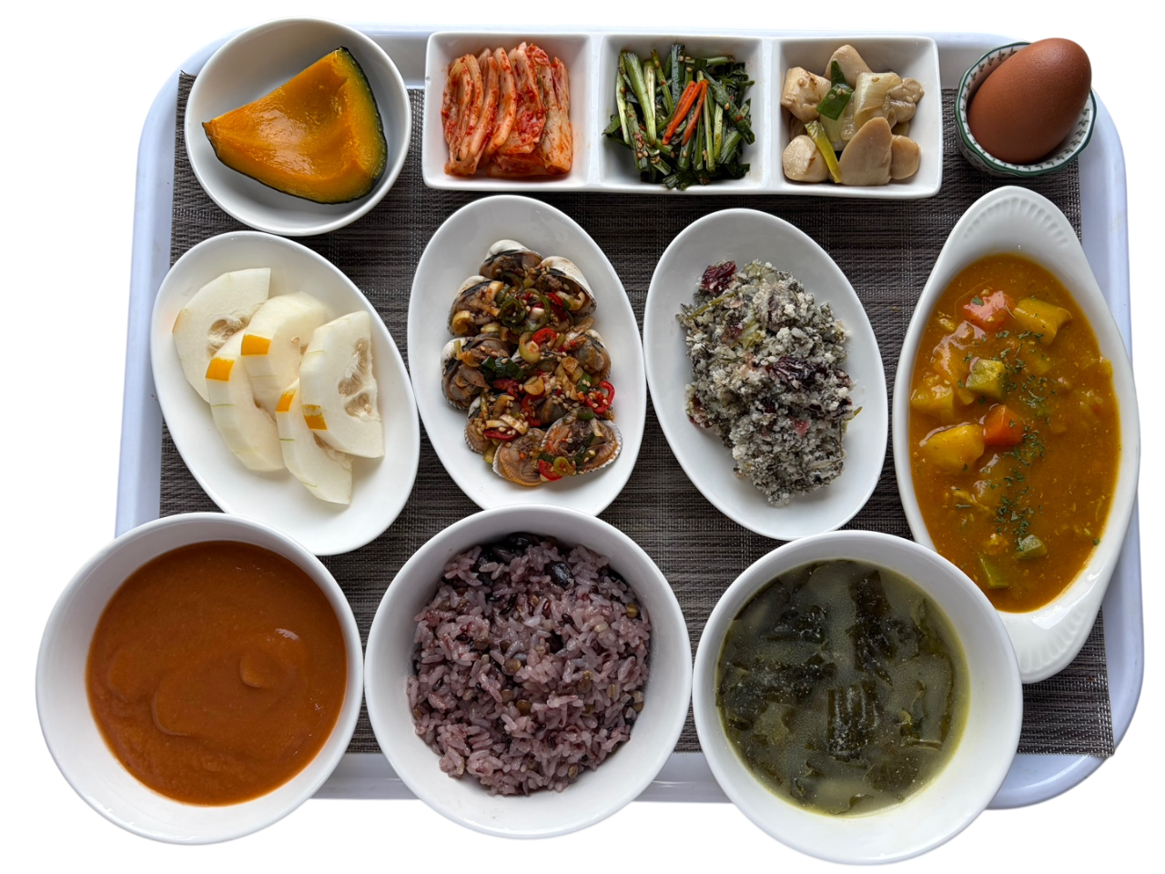 들깨미역국, 토마토커리, 새송이볶음, 부추겉절이, 쑥버무리, 새꼬막양념찜, 참외, 단호박찜 등