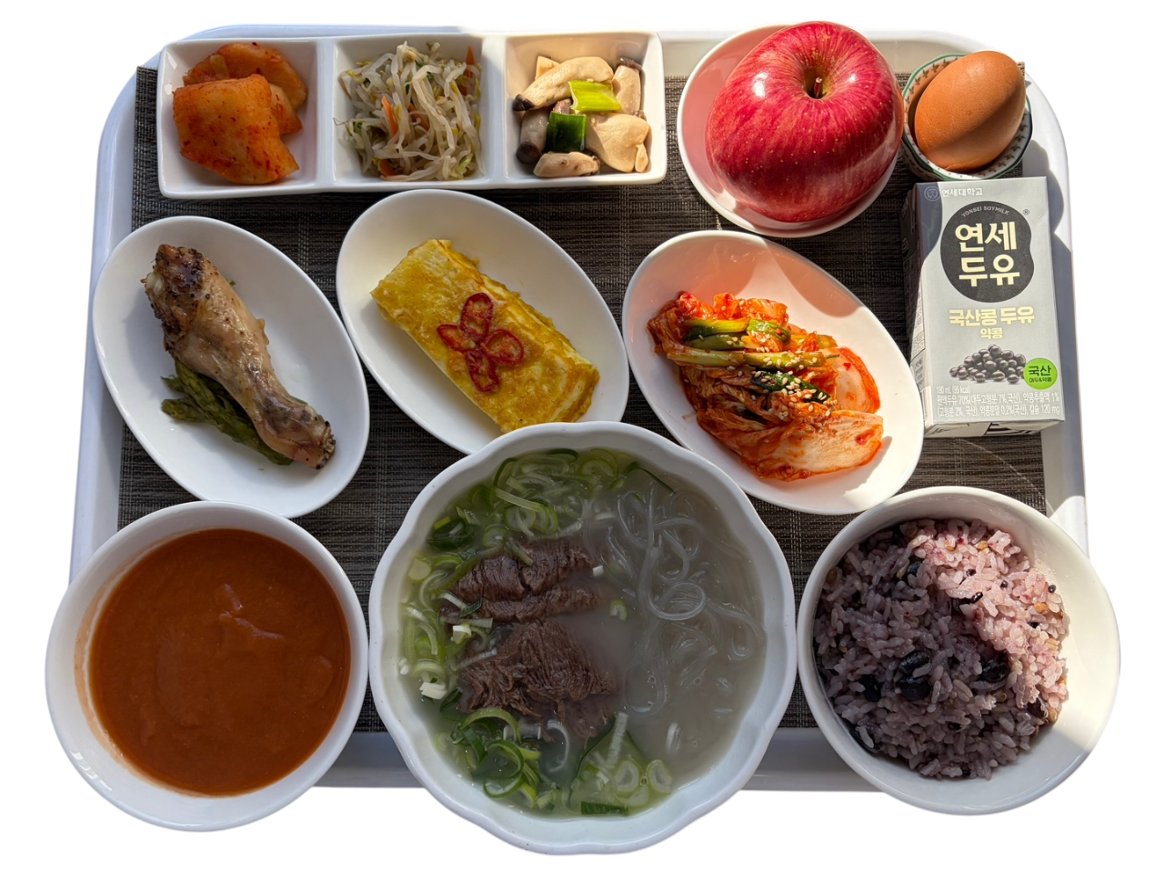 설렁탕, 카레두부전, 애새송이버섯볶음, 숙주나물, 배추겉절이, 미나리나물, 약콩두유 등